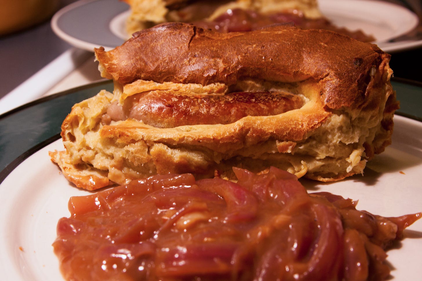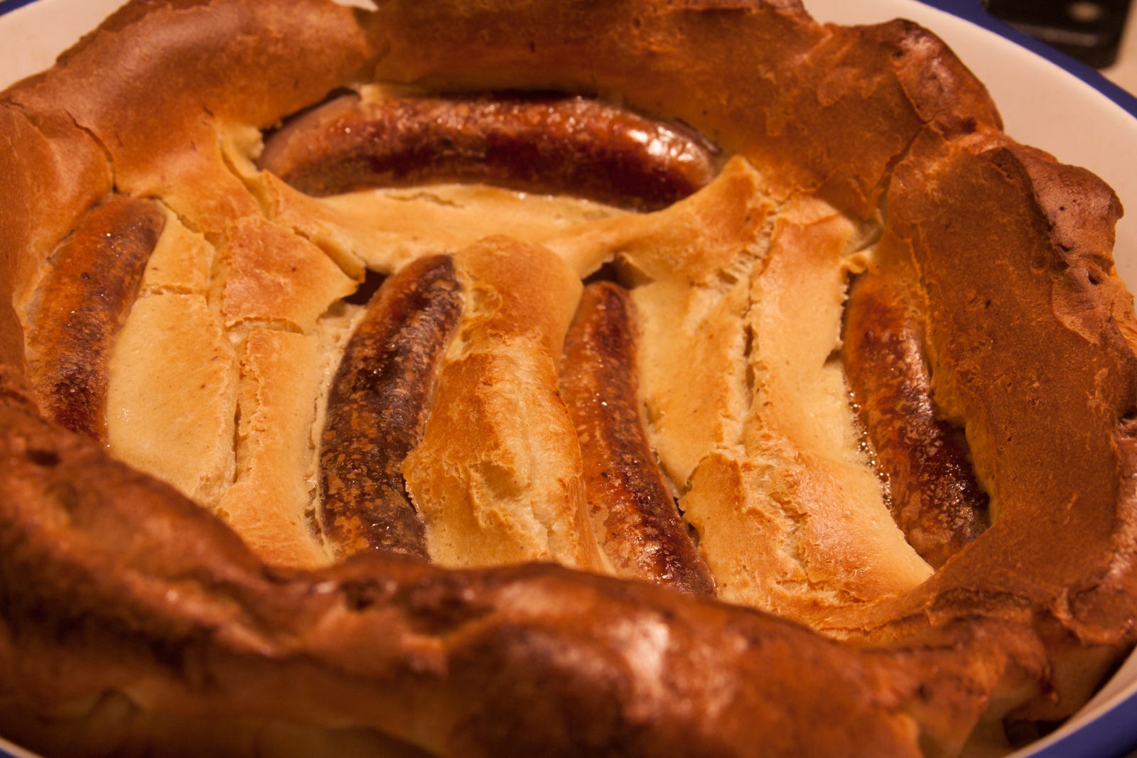 Toad in the Hole to a lot of people, mostly American people, is simply toast with the center cut out and a cooked egg inside. However, it seems that Toad in the Hole is very different to our friends across the pond. When it comes to having things the English way, it turns out to be a two-for-one deal. It is basically a Yorkshire pudding that has a bunch of bangers that are nestled into the middle of it. If you saw my last post on Ireland, you'd know that a banger is a very specific kind of sausage that I sought out for Dublin Coddle, so I decided to use them again here. I'm not sure if I'll offend anyone using Irish branded bangers in an English dish, but I'm sure that I'm not the first to do so!