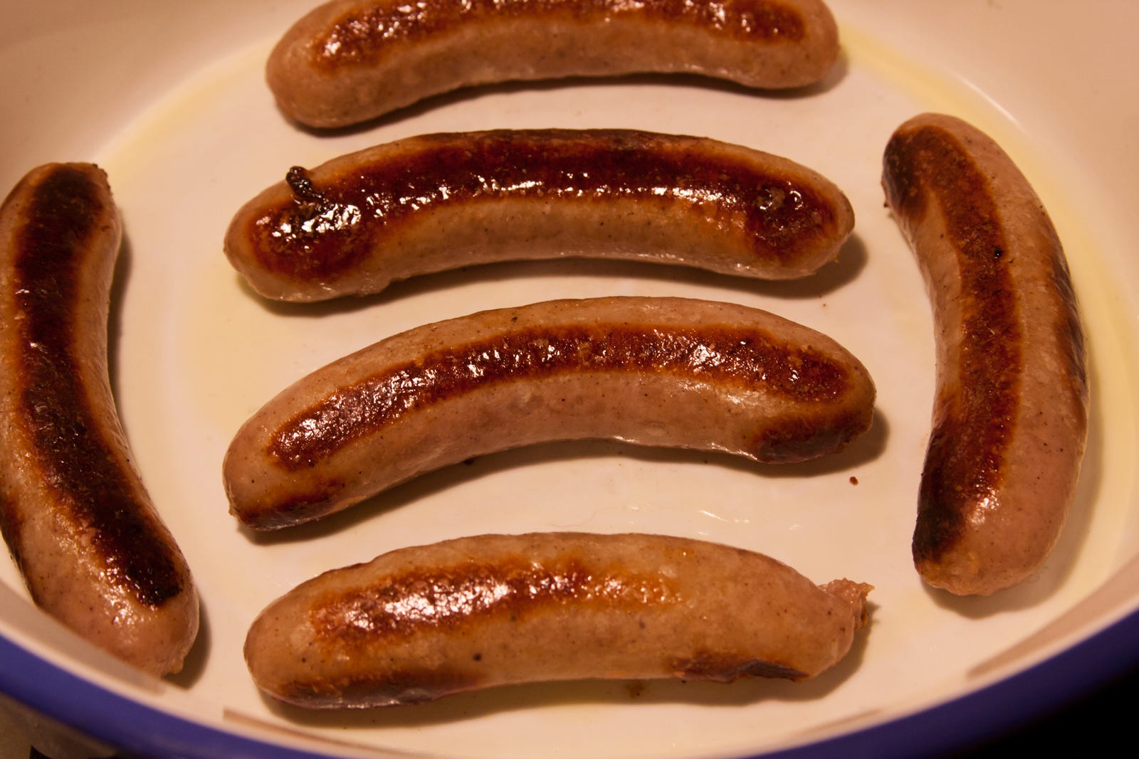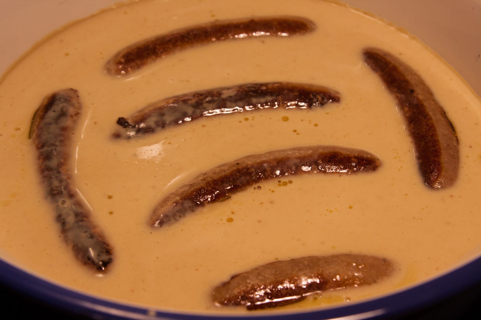 The pot I used was deep, but wasn't really very wide, so my proportion was a bit off. Adjust the number of sausages to fit the pan