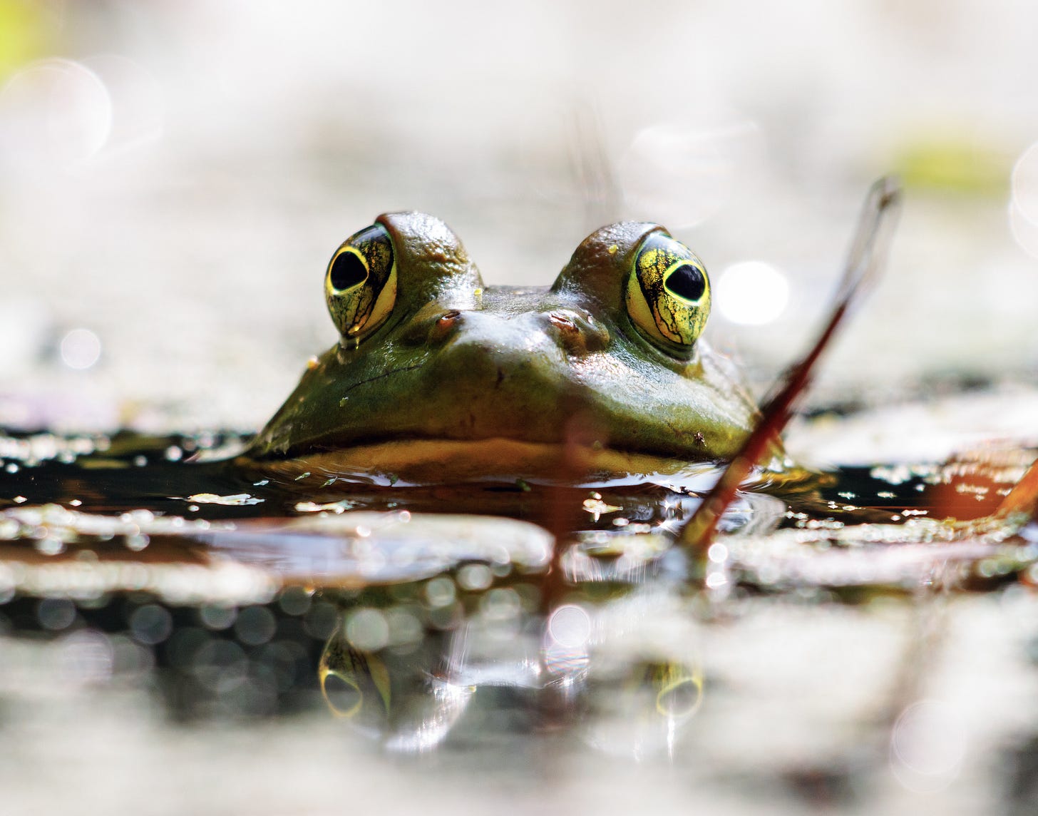 This photo was an exercise in patience. He was definitely watching as I spent fifteen minutes creeping closer and closer along the bank of the pond. A few seconds after this shot, he chirped at me and vanished under the water. So long green sir.